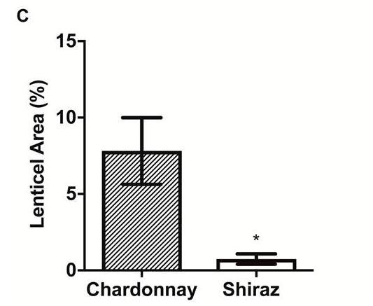 霞多麗(A)和設(shè)拉子(B)漿果花梗之間皮孔形態(tài)和相對(duì)皮孔面積的差異。(C)相對(duì)于霞多麗和設(shè)拉子漿果(室內(nèi)種植,2015年)的花梗表面積,使用ImageJ估計(jì)的扁豆面積。(A)和(B)中的比例尺=1 mm。(C)中的數(shù)據(jù)是平均值±SE,n=5,*顯著不同(t檢驗(yàn),P<0.05)。