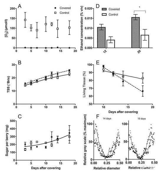 在成熟過(guò)程中用硅脂覆蓋漿果花梗對(duì)完整霞多麗簇的影響(2017年種植室,空心方塊=對(duì)照,實(shí)心圓圈=覆蓋)。(A)[O 2]在漿果的近似中心軸上作為覆蓋花梗后時(shí)間的函數(shù)。雙向方差分析顯示覆蓋花梗減少[O 2](P<0.0001)。(B)覆蓋花梗后漿果的總可溶性固體(TSS)濃度隨時(shí)間的變化。與對(duì)照漿果相比,花梗覆蓋的漿果在實(shí)驗(yàn)過(guò)程中顯示出顯著更高的TSS(雙向方差分析P=0.003;擬合為二階多項(xiàng)式,實(shí)線=對(duì)照,虛線=覆蓋)。(C)作為覆蓋花梗后時(shí)間的函數(shù)的每個(gè)漿果的糖分。糖/漿果處理之間沒(méi)有發(fā)現(xiàn)顯著差異(組合擬合是二階多項(xiàng)式,實(shí)線)。(D)12天和20天后漿果的乙醇濃度,有(填充)和沒(méi)有(開放)硅脂覆蓋花梗。雙向方差分析(Tukey多重比較檢驗(yàn))在覆蓋后20 d顯示出顯著差異(P=0.036)。(E)作為時(shí)間函數(shù)的活組織百分比。覆蓋漿果的擬合線(虛線)非零(P的斜率=0.008)并且不同于未覆蓋漿果的擬合線(實(shí)線)的斜率(P=0.006)。(F)赤道半徑上的熒光信號(hào)(FDA染色,相對(duì)于最大值,高值=較高的活組織)在覆蓋后14天和18天針對(duì)漿果直徑的變化進(jìn)行標(biāo)準(zhǔn)化。每個(gè)都顯示了局部加權(quán)散點(diǎn)圖平滑擬合(LOWESS)。覆蓋(虛線)與對(duì)照(實(shí)線)在兩個(gè)時(shí)間點(diǎn)都顯著不同(雙向方差分析,P<0.001)。數(shù)據(jù)是平均值±SE,n=3,除了(F)未顯示SE。