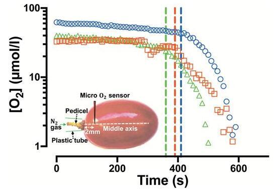花梗在氣體擴(kuò)散到Ruby Seedless葡萄中的作用(2016-2017季節(jié)為132 DAA)。三個(gè)單獨(dú)漿果的[O2]作為時(shí)間的函數(shù),傳感器插入大約Ruby Seedless的中心軸,距花梗約2毫米。虛線表示在花梗上開始外部N2氣體輸送。不同的符號(hào)表示不同的漿果。插圖:在測(cè)量[O2]的同時(shí)在漿果花梗上施加N2氣體的實(shí)驗(yàn)裝置。