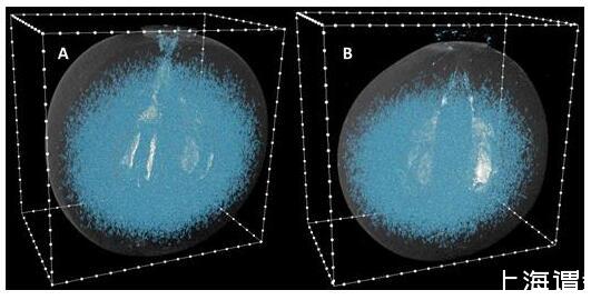 X射線顯微CT確定的霞多麗漿果中的空氣空間。(A)在98 DAA(19.3°Brix)和(B)在154 DAA(24.5°Brix)在2015-2016季節(jié)。圖像已被處理以指示漿果輪廓。最小體素截止值為500。框輪廓上的白點(diǎn)間隔1毫米。