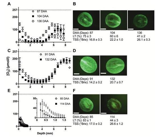 [O2]霞多麗、紅寶石無(wú)核和設(shè)拉子漿果(A、C、E)在不同成熟階段的[O2]剖面圖以及每個(gè)品種(B、D、F)果皮中活組織(LT)的相應(yīng)示例。(A)霞多麗漿果在2015-2016季節(jié)的DAA為87、104和136時(shí)采樣。雙向方差分析(重復(fù))顯示,深度占總變異的46.7%(P<0.0001),時(shí)間占總變異的29.9%(P<0.0001),交互作用占總變異的8.0%(P=0.058))。水平虛線表示室溫下Millipore水的近似O2飽和值,與測(cè)量時(shí)的漿果相同。(B)用FDA染色的內(nèi)側(cè)縱向切片(霞多麗),突出了不同成熟階段的LT差異(對(duì)應(yīng)于A)。(C)2016-2017季節(jié)在91和132 DAA下采樣的Ruby無(wú)核漿果的[O2]配置文件。雙向方差分析(重復(fù))顯示深度占總變異的85.2%(P<0.0001),時(shí)間占總變異的1.2%(P=0.0025),交互作用占總變異的3.7%(P=0.048))。(D)Ruby Seedless的LT在兩個(gè)相應(yīng)的采樣日接近100%。(E)2014-2015季節(jié)在85和114 DAA上采樣的設(shè)拉子漿果的[O2]配置文件。插圖顯示了1.5毫米的輪廓細(xì)節(jié)。雙向方差分析(重復(fù))顯示,深度占總變異的40.9%(P=0.0005),時(shí)間占總變異的19.6%(P<0.0001),交互作用占總變異的6.4%(P=0.43))。(F)設(shè)拉子的LT。數(shù)據(jù)是平均值±SE,對(duì)于(A)、(C)和(E),n=3。