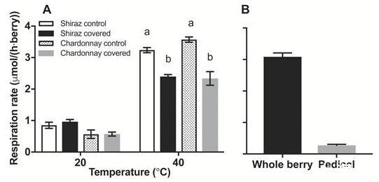 花梗在氧擴(kuò)散中作為溫度的函數(shù)的作用。(A)霞多麗(86 DAA)和設(shè)拉子(77 DAA)漿果(每個(gè)漿果)在20°C和40°C下的呼吸,并附有花梗(2016-2017季節(jié))。硅脂覆蓋花梗上的皮孔(覆蓋漿果)。在20°C下,兩個(gè)品種的對(duì)照和花梗覆蓋的漿果之間的表觀漿果呼吸沒(méi)有顯著差異。不同的小寫字母表示每個(gè)品種在40°C處理之間的顯著差異(雙向方差分析,P<0.0001)。Shiraz和Chardonnay在40°C時(shí)每個(gè)漿果的呼吸作用分別降低了839.7±101.8 nmol h-1和1377.3±161.3 nmol h-1(降低了26%和39%)。(B)整個(gè)漿果的呼吸速率,包括附著的花梗和霞多麗在40°C下的分離花梗的呼吸?;üU颊麄€(gè)漿果呼吸率的9%。數(shù)據(jù)是平均值±SE,n=3。