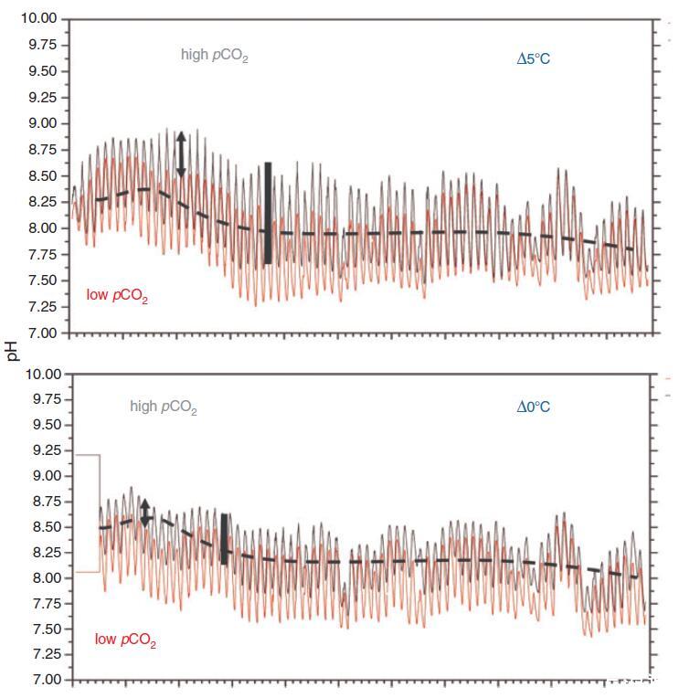 圖 6. Kiel Benthocosms:在兩種溫度狀態(環境為 D08,溫暖或“未來”為 Dt58C)和兩種酸化狀態(低 pCO2 或“環境”在 400 matm(淺灰色下曲線)下的波動 Delta pH 處理;底棲動物帶帽頂空處的高 pCO2 或“未來”為 1100 matm(深灰色上部曲線))。 快速振蕩(由垂直黑線表示的高 pCO2 狀態的振幅)是生物信號,可歸因于底棲動物群落光合作用和呼吸的晝夜節律變化。 黑色虛線表示基爾峽灣 pH 值的季節性下降。 雙頭箭頭表示頂空 pCO2 處理對底棲動物 pH 值的影響。 盡管在頂部空間空氣的 pCO2 增強中應用了相同的處理強度,但這意味著較低溫度下的 pH 值差異較小。 pH 值的生物源晝夜波動在較冷的區域也具有較小的幅度。