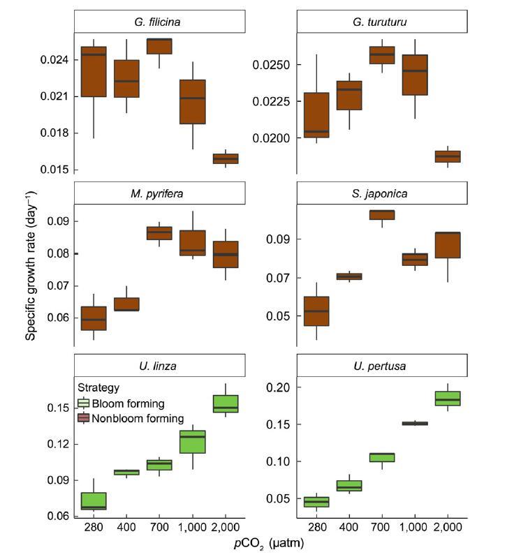 圖 1 開花形成(淡綠色)和非開花形成(淺棕色)大型藻類的特定增長率在它們對 pCO2 升高(F10,55 = 20.51,p < .001)。 在碳富集下,pCO2 水平在 280 到 2,000 latm 之間,增長率增加 在形成開花的大型藻類中強(qiáng)烈,而多年生的非開花形成物種對升高的 pCO2 水平顯示出單峰反應(yīng), 在大約 700 latm pCO2 時的最高增長率。 箱線圖按標(biāo)準(zhǔn)顯示,粗線表示中位數(shù),而粗線表示中位數(shù) 框作為下四分位數(shù)和上四分位數(shù)的末端,胡須延伸到 1 個四分位距 (IQR) 內(nèi)的最高和最低值 下/上四分位數(shù)。 n = 3 每個物種每個 pCO2 水平。