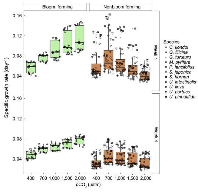 圖 2 生長響應(yīng)曲線 成花(淡綠色)和非成花 (淺棕色)物種響應(yīng) 在開始時升高 pCO2(一周 1,上圖)和結(jié)束(第 4 周,下圖) 面板)的室內(nèi)潛伏期 中觀。 就像在實驗室里 治療,生長率響應(yīng) 成花過程中 pCO2 水平升高 物種(雖然增加 增長不像過去那樣呈指數(shù)增長 實驗室環(huán)境),而非開花 物種表現(xiàn)出單峰 響應(yīng),增長達(dá)到峰值 700 和 1,000 latm pCO2 (F2,30 = 64.84, p < .0001)。 增長率下降 對所有場景中的所有物種都有顯著影響。 箱線圖按標(biāo)準(zhǔn)顯示,帶有 中位數(shù)作為粗體帶,和胡須 擴展到第一個四分位距。 覆蓋箱線圖的形狀表明 單個物種,每個物種的 n 為 每個 pCO2 水平 = 6。 [顏色數(shù)字可以 在 wileyonlinelibrary.com 上查看]