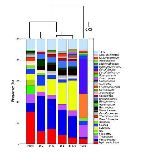 圖4.ONKALO地下水和FCCS生物膜樣品的v4v6熱標(biāo)簽測(cè)序文庫(kù)的組成。顯示了頻率豐度≥1%的序列。酒吧名稱:KR15=ONK-KR15地下水采樣于2012年4月17日;bf 0=第0天的生物膜;bf C=第103天的對(duì)照生物膜;bf S=第103天的硫酸鹽生物膜;bf S 6=第103天的硫酸鹽+ONK-PVA6生物膜;PVA6=2012年4月17日采樣的ONK-PVA6地下水。不適用:未注釋。條形圖上方的樹描繪了Morisita-Horn距離度量,該度量使用具有算術(shù)平均值(UPGMA)的未加權(quán)對(duì)組方法構(gòu)建,并具有物種級(jí)別的分類深度。比例尺代表5%的核苷酸取代。