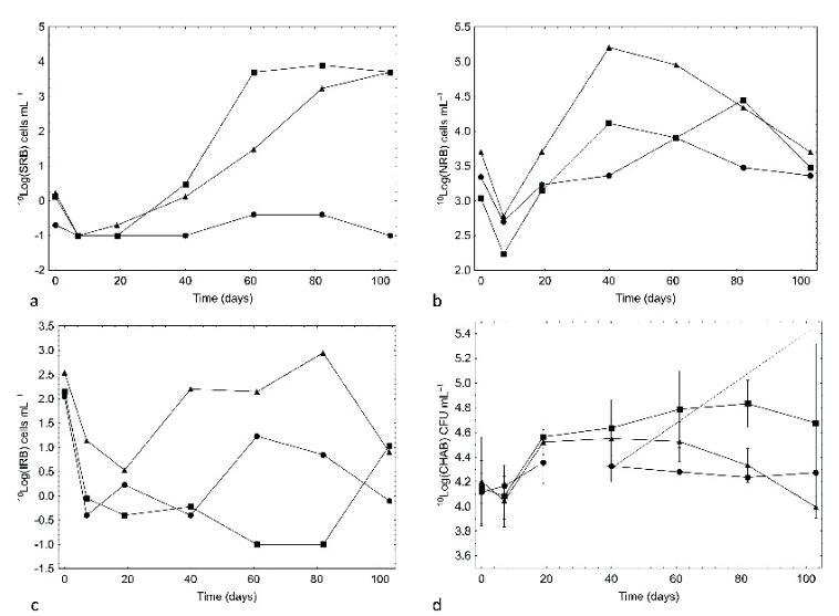 SRB的MPN增加到大約10 4個(gè)細(xì)胞mL-1在兩種硫酸鹽修正的FCCS中都并且中接近檢測(cè)極限(即,0.2個(gè)細(xì)胞mL-1在缺乏硫酸鹽的對(duì)照FCCS)(圖3a)。NRB的MPN在硫酸鹽+ONK-PVA6 FCCS中40天后最高(圖3b)。在實(shí)驗(yàn)開始和結(jié)束時(shí),所有三個(gè)FCCS都具有相似的NRB MPN。IRB的MPN隨時(shí)間變化,在硫酸鹽+ONK-PVA6 FCCS中最高(圖3c)。同樣,在所有FCCS的整個(gè)實(shí)驗(yàn)過程中,CHAB的數(shù)量大致相似,平均約為5×10 4細(xì)胞mL-1(圖3d)。AA的MPN在對(duì)照系統(tǒng)中處于檢測(cè)極限,增加至最多1-10 AA mL-1在硫酸鹽修正系統(tǒng)中,并且在任何FCCS中均未產(chǎn)生乙酸鹽。在所有FCCS的所有采樣場(chǎng)合,HM的MPN均低于檢測(cè)限。乙酸鹽和DOC的濃度相對(duì)于采樣時(shí)間0的起始值沒有變化,分別為18μM乙酸鹽和0.25μM DOC。
