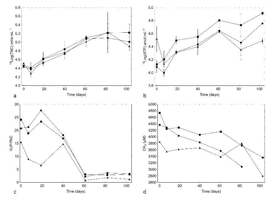 圖2.(a)細(xì)胞總數(shù)(TNC),(b)ATP濃度,(c)每細(xì)胞總數(shù)(TNC)中病毒樣顆粒(VLP)的數(shù)量,以及(d)溶解甲烷的濃度在通過三個(gè)流通池柜循環(huán)的地下水中,補(bǔ)充有500 mL ONK-KR15地下水(?)、500 mL ONK-KR15地下水和1 mM NaSO 4(?),以及500 mL ONK-PVA6地下水和1 mM NaSO 4(?)。條形表示±1標(biāo)準(zhǔn)偏差;n=3 in(a)–(b)。