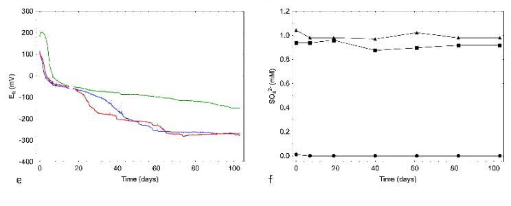 圖3.(a)硫酸鹽還原菌(SRB)的最可能數(shù)(MPN),(b)硝酸鹽還原菌(NRB)的MPN,(c)鐵還原菌(IRB)的MPN,(d))可培養(yǎng)的異養(yǎng)需氧菌(CHAB),(e)E h使用內(nèi)部電極對(duì)測(cè)量的:四個(gè)電極信號(hào)的平均值(e中的藍(lán)線),在硫酸鹽流通池循環(huán)系統(tǒng)(FCCS)中(e中的紅線),和在硫酸鹽+ONK-PVA6 FCCS中(e中的綠線),以及(f)通過三個(gè)FCCS循環(huán)的地下水中的硫酸鹽濃度,并輔以500 mL ONK-KR15地下水(?)、500 mL ONK-KR15地下水和1 mM NaSO 4(?),以及500 mL ONK-PVA6地下水和1 mM NaSO 4(?)。