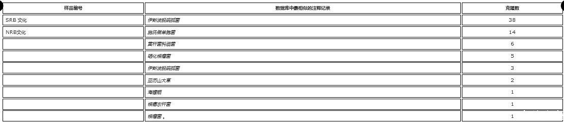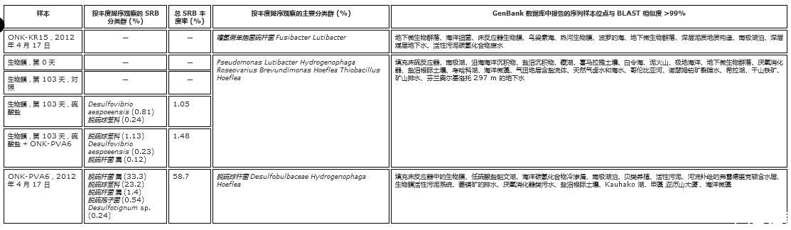 表5.在第82天和第103天從硫酸鹽和硫酸鹽+ONK-PVA6流通池循環(huán)系統(tǒng)采樣的SRB和NRB MPN培養(yǎng)物克隆中檢測(cè)到的分類群