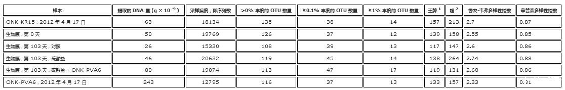 表6.使用帶有MXPro軟件的Stratagene MX3005p熒光計(jì)和Molecular Probes的Quant-it Picogreen試劑盒進(jìn)行熒光分析的提取雙鏈DNA的量;在地下水和生物膜序列庫(kù)中觀察和估計(jì)的總OTU水平(>0%序列豐度)的多樣性