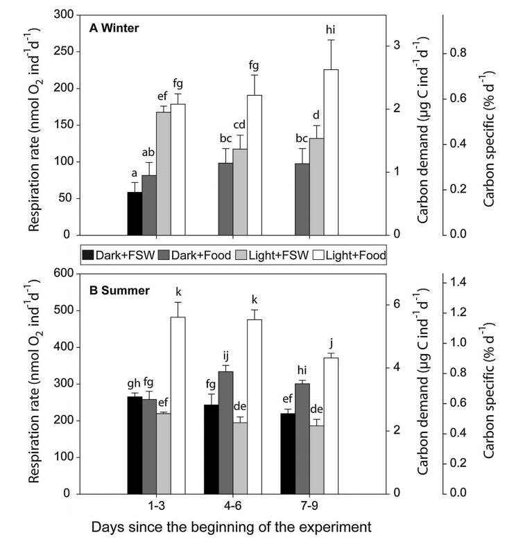 圖 2 呼吸速率,碳 每個(gè)人的需求率, 和碳特定需求 天 (nmol O2 ind-1 day-1, lg C ind-1 day-1 和 % day-1 分別)和標(biāo)準(zhǔn) 每次處理的偏差, 黑暗和過濾的海水 (黑暗+FSW),黑暗和食物 加成(暗+食物),光 暴露和過濾海水 (Light+FSW) 和 Light and 食物添加 (Light+Food),對(duì)于 一個(gè)冬天和一個(gè)夏天。 因?yàn)?技術(shù)問題,沒有結(jié)果 可用于第 4-9 天 Dark+FSW 中的治療 十一月。 對(duì)于所有碳特定需求結(jié)果, 不同的字母表示 之間的顯著差異 處理(單向方差分析, 迷幻劑; p \0.05)。 請(qǐng)注意 每個(gè)不同的 y 軸比例 季節(jié)