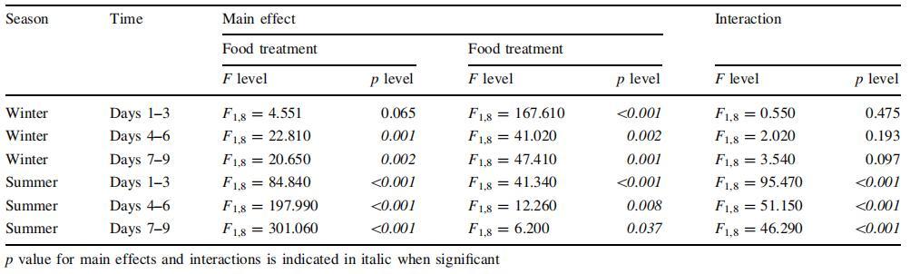 表 1 每個(gè)時(shí)間間隔的 C 特定需求率的雙向 ANOVA,包括食物處理 (Food/FSW) 和光照狀態(tài) (Light/FSW) 暗)為主要因素