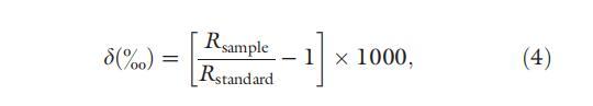 沉積物中孔隙水濃度在 0-10 cm 范圍內(nèi)的所有深度進行測量。 此外,在7 cm以下的深度測量孔隙水的碳和氫穩(wěn)定同位素,以闡明沉積物中形成甲烷的途徑。 將大約 6 g 切片的濕沉積物插入 20 mL 血清瓶中,并向瓶中加入 1 mL 飽和氯化汞以阻止任何微生物活動。 然后用丁基塞子卷曲密封瓶子。 在分析之前,將樣品置于熱水浴(約 80°C)中 15 分鐘,以對沉積物中溶解的蒸發(fā)進行脫氣。 對于地下水測量,大約 10 mL 未過濾的地下水被收集到 10 mL 丁基塞血清瓶中。 在用丁基塞進行卷邊密封之前,將 1 mL 等分的飽和氯化汞加入瓶中。 用同位素比監(jiān)測氣相色譜質(zhì)譜儀測定了鎂的濃度和穩(wěn)定同位素組成。 穩(wěn)定同位素組成由下式計算: