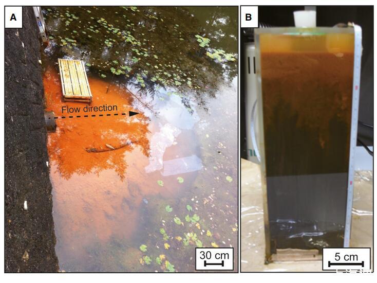 圖 1 日本廣島大學(xué)武道池(A)沉積物照片。 地下水從管道供應(yīng)到開放的池塘。 大量的 Fe(III) 沉積物散布在管道附近。 箭頭表示地下水的流動方向。 從圖 A 所示的管道(地下水源)30 厘米處收集的 (B) 沉積物芯的照片。在一系列沉積物中,顏色明顯變化。