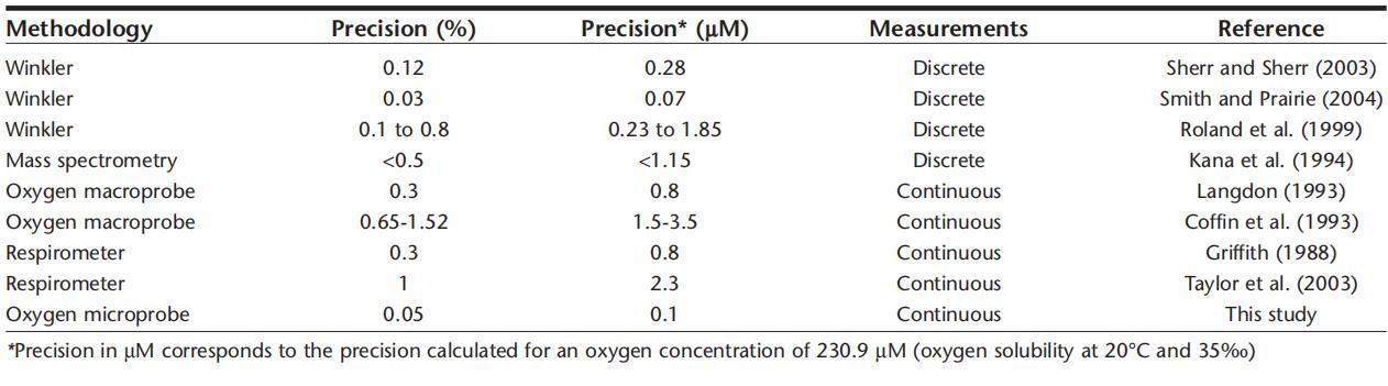 使用氧氣微探針測量細菌呼吸可以解決離散測量中遇到的主要問題之一:在黑暗培養期間監測氧氣減少。在這項研究中進行的27項測量中,只有9項顯示出氧濃度的線性下降,其他的顯示出某種程度上與水的營養狀態相關的趨勢。這種監控有兩個主要優點。首先,通過跟蹤氧濃度與時間的關系,可以檢測到顯著耗氧量的開始。由于采用了保護陰極(Revsbech 1989),氧氣微探針不會消耗氧氣,并且顯示出約0.1μM O2的高精度,該值與在高精度Winkler測量中觀察到的值相似(見表2)。然而,這種高靈敏度被背景噪聲抵消,背景噪聲通常發生在用微探針測量氧氣的過程中。因此,在浮游水域進行氧氣測量時,0.1μM的理論精度實際上降低到0.5μM O2。