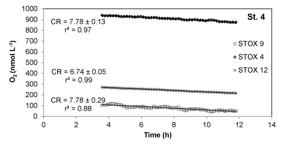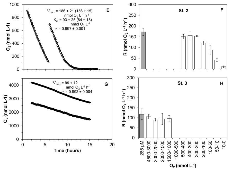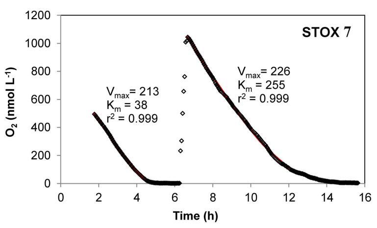 耗氧和隨后注入空氣飽和水后測(cè)定的表觀(guān)Km值與6月和9月St.1第一次耗氧曲線(xiàn)所得值相似。具體而言,對(duì)于6月的St.1,第一次消耗曲線(xiàn)的平均視在Km值6 St.誤差(n)為83611(3)nmol L-1 O2,在添加約1 mmol L-1 O2及其后續(xù)消耗后,視在Km值為118625(3)nmol L-1 O2。9月,注入約0.5 mmol L-1 O2后,表觀(guān)Km值首先為73625(3),然后為85626(3)nmol L-1 O2。然而,對(duì)于9月的St.2,第二次耗氧曲線(xiàn)導(dǎo)致表觀(guān)Km值從第一次運(yùn)行的179增加到第二次運(yùn)行的310 nmol L-1 O2(表1和圖5“STOX 7”)。