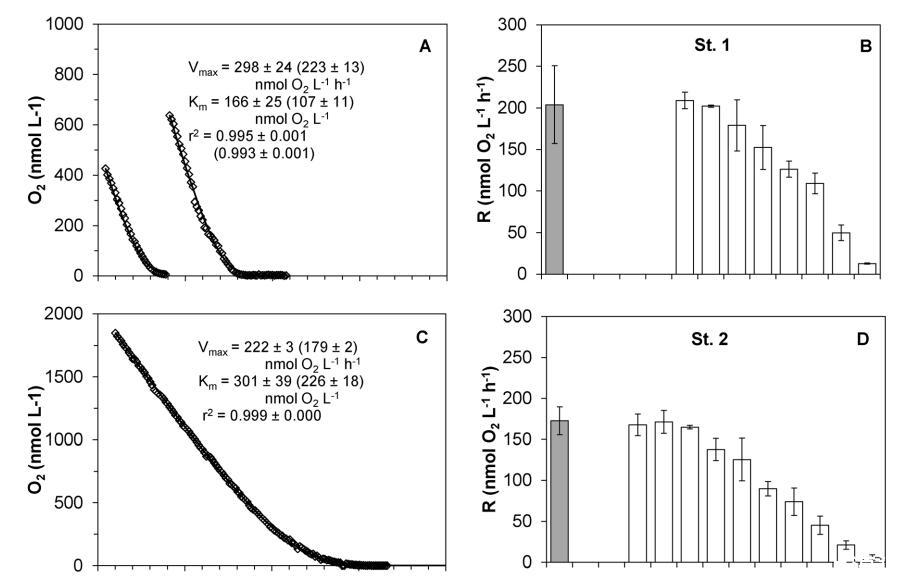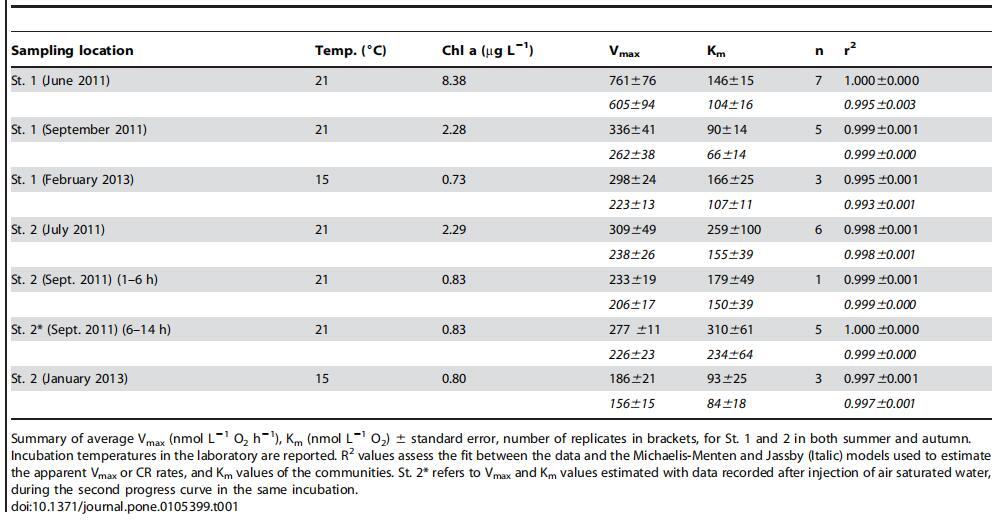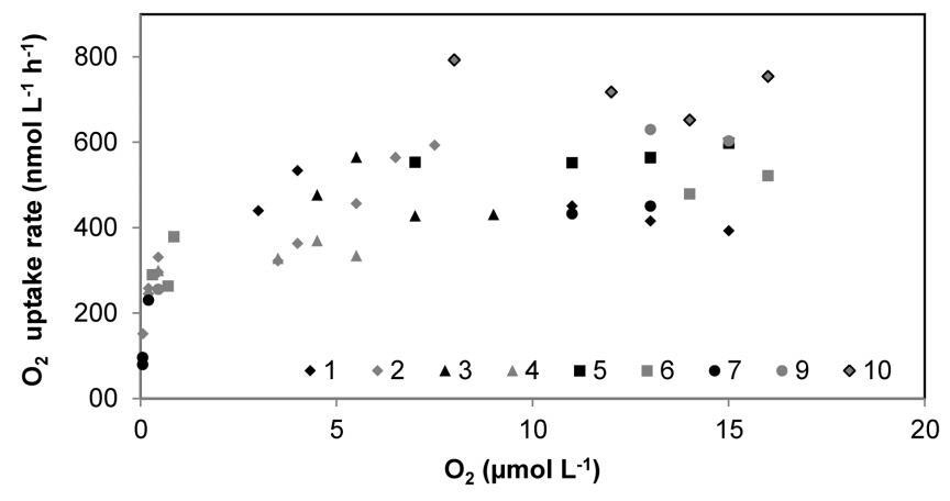 呼吸速率可能與水的預(yù)處理有關(guān)。這可以從第二次耗氧實(shí)驗(yàn)(圖5和表1:St.2*,2011年9月,6–14小時(shí))中對(duì)Km值的不同估計(jì)中看出。長(zhǎng)期暴露于完全缺氧是應(yīng)該避免的一個(gè)因素,因?yàn)樗ǔ?huì)導(dǎo)致非常不同的速率和Km值。此外,由于應(yīng)允許社區(qū)適應(yīng)新的條件,應(yīng)丟棄孵化前1-2小時(shí)的數(shù)據(jù)[58]。建議使用2至16小時(shí)的數(shù)據(jù)確定動(dòng)力學(xué)參數(shù)。超過(guò)16–20小時(shí)的孵化可能會(huì)導(dǎo)致高度錯(cuò)誤的數(shù)據(jù),至少在公海水樣中是如此(L.Tiano等人在準(zhǔn)備中)[22]。