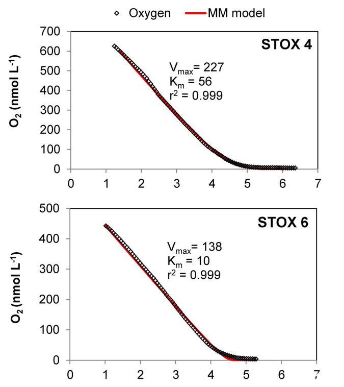 圖5。沿海海水樣品中氧氣消耗曲線(xiàn)的建模示例。2011年9月,來(lái)自圣二號(hào)碼頭(Marselisborg Marina)的三個(gè)培養(yǎng)瓶(4、6、7)的耗氧實(shí)驗(yàn)。氧氣耗盡后(6小時(shí)),將空氣飽和水注入“STOX 7”瓶中。點(diǎn)顯示STOX傳感器記錄的O2值。最大速率(Vmax)和半飽和常數(shù)(Km)通過(guò)最小二乘擬合(紅色實(shí)線(xiàn))確定,使用公式(2),源自Michaelis-Menten動(dòng)力學(xué)。該方法的擬合度相對(duì)較差,可能導(dǎo)致低估“STOX 6”的Km值。內(nèi)政部:10.1371/期刊。波內(nèi)。0105399.g005