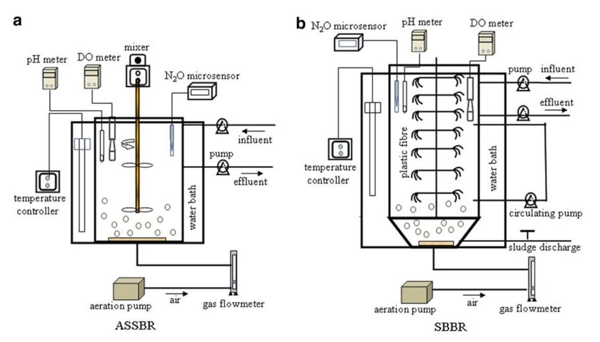 圖1。實驗系統(tǒng)的示意圖說明:(a)為ASSBR,(b)為SBBR。ASSBR,活性污泥序批式反應(yīng)器;SBBR,序批式生物膜反應(yīng)器。