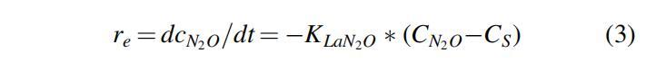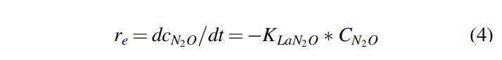 式中,KLaN2O是N2O從水到空氣的體積傳質(zhì)系數(shù)(s-1);CN2O為液體中的N2O濃度(mg N/L);CS為與空氣平衡的液體中的N2O飽和濃度(mg N/L;假設(shè)為0);t是時間(秒)。方程式(3)改寫為: