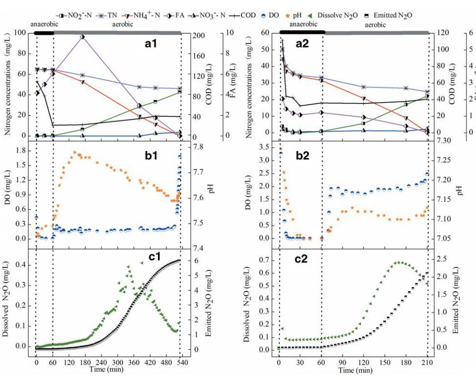 圖2。在兩個SBR循環(huán)中,低氨氮(120 mg/L)的氮化合物和控制參數(shù)的典型變化:(a1、b1、c1)是ASSBR中的COD、氮化合物、pH、DO和N2O;(a2、b2、c2)是SBBR中的COD、N-化合物、pH、DO和N2O。溶解氧;FA,游離氨。
