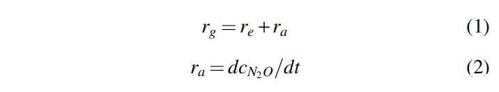 N2O生成[rg;mg N/(L$s);等式(1)]、累積[ra;mg N/(L$s);等式(2)]和排放[re;mg N/(L$s);等式(3)]率是使用基于在線N2O液體濃度測量的余額計算的(J.Gabarro等人,2014年)。