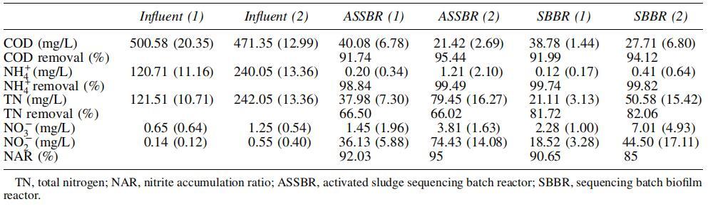 表1顯示了兩種SBR的污染物去除性能。ASSBR和SBBR的COD去除率均在91%以上。在這兩個(gè)反應(yīng)器中,進(jìn)水中幾乎所有的NH4+-N都被完全去除,去除率為98–99%。然而,兩種反應(yīng)器的TN去除效率存在明顯差異,ASSBR和SBBR的TN去除效率分別為66.02–66.50%和81.72–82.06%。在兩個(gè)反應(yīng)器的好氧階段結(jié)束時(shí),NAR的85%以上出現(xiàn)了明顯的亞硝酸鹽積累。在相同進(jìn)水負(fù)荷下,ASSBR的NO2-N濃度顯著高于SBBR。