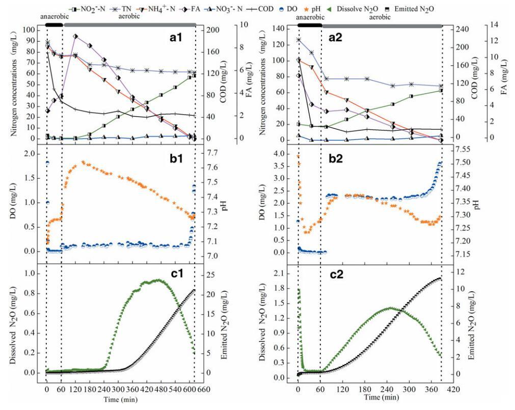 圖3。在兩個(gè)SBR循環(huán)中,含較高氨氮(240 mg/L)的氮化合物和控制參數(shù)的變化:(a1、b1和c1)是ASSBR中的COD、氮化合物、pH、DO和N2O;(a2、b2和c2)是SBBR中的COD、N-化合物、pH、DO和N2O。ASSBR,活性污泥序批式反應(yīng)器。