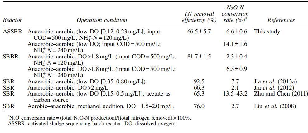 在其他文獻(xiàn)中,厭氧-好氧工藝的TN去除率為51.0–92.5%。在本研究中,ASSBR的TN去除效率為66.5%±5.7%,與Jia等人(2012)的結(jié)果相似;朱和陳(2011)。與上述三項(xiàng)研究相比,低溶解氧條件下的N2O排放量(6.6–43.2%)遠(yuǎn)高于高溶解氧條件下的N2O排放量(2.1%),這表明低氧刺激了N2O的排放。本研究中SBBR的TN去除效率相對(duì)較高(81.7%±1.5%),與Jia等人(2013a)和Liu等人(2008)相似。同時(shí),高TN去除效率工藝的N2O排放率(2.3–7.7%)相對(duì)低于低TN去除效率工藝,這表明提高TN去除效率可能會(huì)減少N2O的產(chǎn)生。