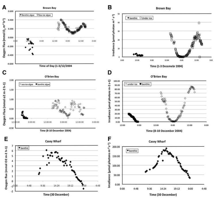 表1總結(jié)了物理和生物現(xiàn)場參數(shù)。氧電極試驗(yàn)期間,不同地點(diǎn)的Chl-a生物量不同。奧布萊恩灣(OBB)的海冰、底棲和浮游植物chl-a分別約為布朗灣(BB)的50、65和3倍。凱西碼頭(CW)的底棲和浮游植物chl-a生物量幾乎是奧布萊恩灣的3倍。在三個(gè)取樣生態(tài)系統(tǒng)組成部分中,底棲chl-a生物量通常最高(CW=186±146,OBB=71.5±63.3,BB=1.10±0.55 mg chl-a m-2)(表1)。在實(shí)驗(yàn)期間,海冰和底棲生物的冰下水溫保持在-1.9℃左右,而冰爆發(fā)后水溫上升到-1.7℃。在BB和OBB處,冰的厚度約為1.4 m,而在CW處,冰在取樣期之前已經(jīng)融化。