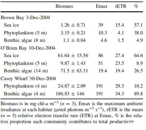 P一地區(qū)記錄的值基本一致。雖然Fv/Fm、Ek、a和rETRmax(冰層破裂前)具有可比性,但在2003年的研究中(McMinn等人,2004年),冰層破裂后的rETRmax相當(dāng)高。然而,由于無法進(jìn)行分類比較,因此無法確定原因。