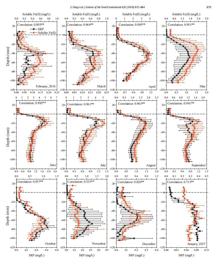 圖5。2016年2月至2017年1月太湖梅梁灣沉積物水剖面中可溶性活性P(SRP)和可溶性Fe(II)的月分布。所示數值為SRP和可溶性Fe(II)之間的相關系數,雙星號表示pb 0.01水平的顯著性。