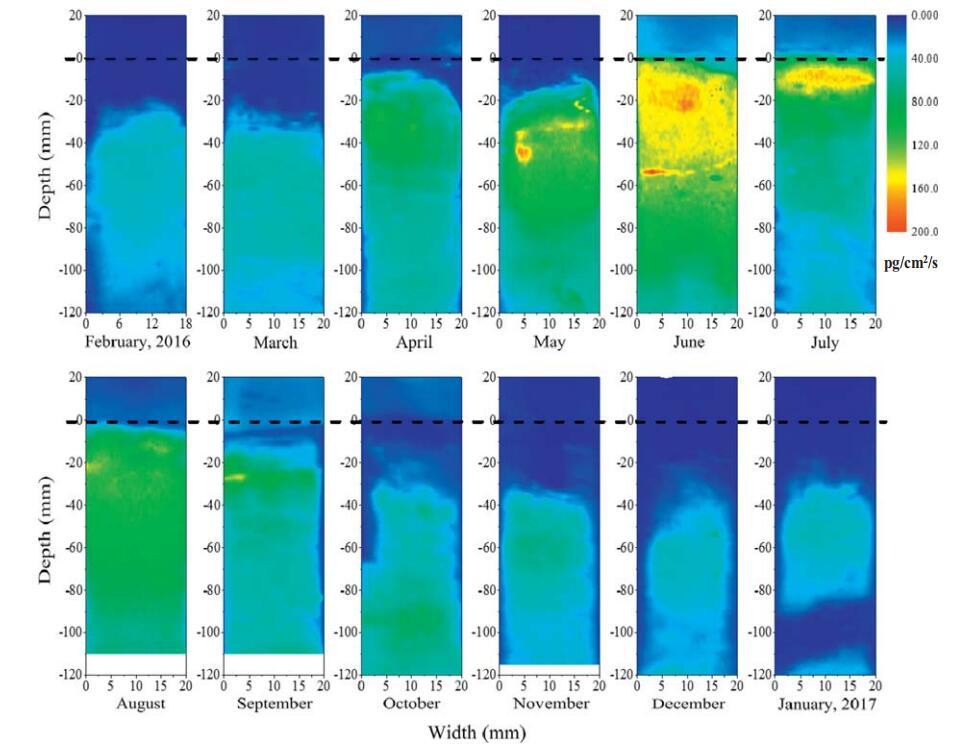 每個月的DGT不穩定P(以DGT通量表示)的2D分布在亞毫米級進行成像(圖6)。很明顯,在2月份的整個剖面中,DGT通量相對較低,但在6月份之前,DGT通量呈上升趨勢,隨后在2017年1月之前呈下降趨勢。DGT通量在6月份最大,其次是7月份。同時,6月和7月的最高濃度高于其他月份,深度顯示最高濃度更接近SWI。