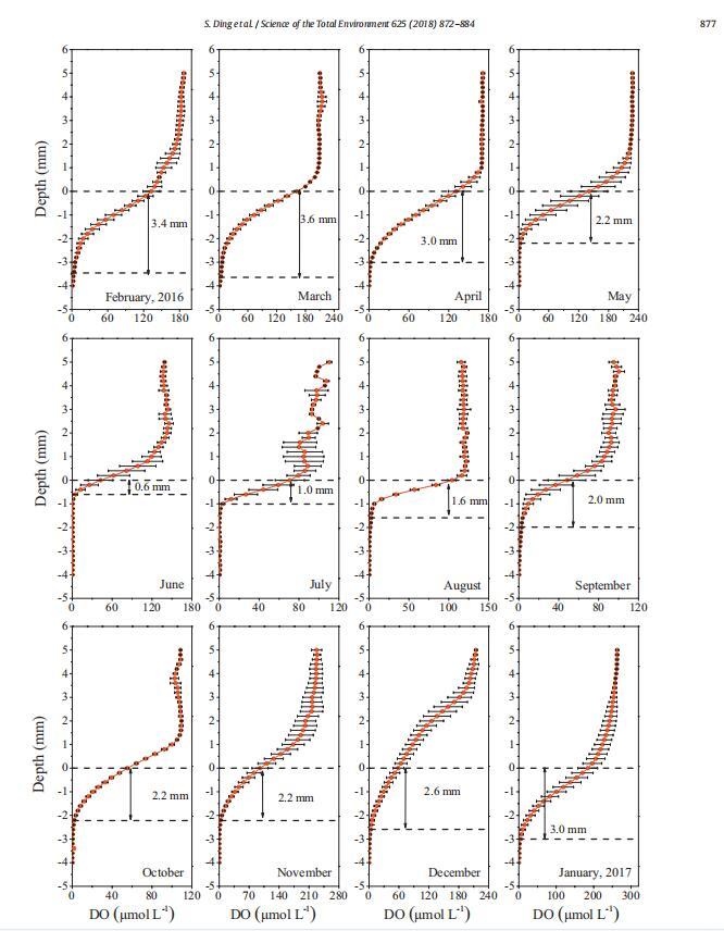 圖3。2016年2月至2017年1月期間每個月沉積物水剖面中溶解氧濃度和滲透深度的變化。數值為三次重復分析的平均值±標準差。