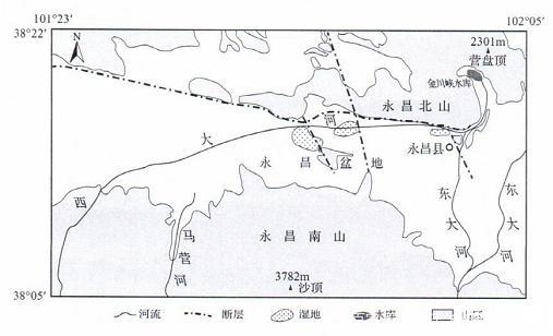 河西走廊西大河流域的永昌盆地介于永昌南山與永昌北山之間(下圖),海拔1875~2106m,地勢自西南向東北傾斜。盆地內分布有若千塊濕地,這些濕地的形成是地形、地質條件及地表水、地下水共同作用的結果。金川峽水庫位于盆地最低處,是當地生產和生活的重要水源地。