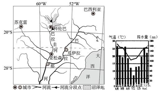 巴拉圭河是南美洲第五大河流,是巴拉那河的主要支流。科倫巴以上為中、上游,以下到與巴拉那河交匯處為下游。巴拉圭河上游位于起伏的巴西高原,中下游均位于低洼的巴拉圭平原,流域內地表多為黏重的土壤。巴拉圭河中上游沿岸沼澤濕地為世界上最大的濕地,面積季節變化明顯,生物資源豐富。近年來,隨著人類過度占用資源,濕地被大量改造開墾,保護濕地成為迫在眉睫的問題。下圖為巴拉那—巴拉圭河流城圖和科倫巴附近氣候統計圖。