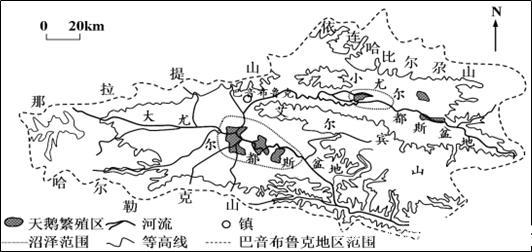 巴音布魯克濕地發育于天山山脈中部大、小尤爾都斯盆地中。盆地內河流蜿蜒,流向區外。冬季嚴寒,年平均氣溫-4.7℃。巴音布魯克濕地內有國家級天鵝自然保護區,棲息著大量的野生天鵝。濕地周圍草場廣闊,是傳統的畜牧業區。20世紀中后期,出現過牧現象。同時,每年都有大量的畜群進入自然保護區,嚴重干擾了天鵝的生存與繁衍。下圖為巴音布魯克地區示意圖。