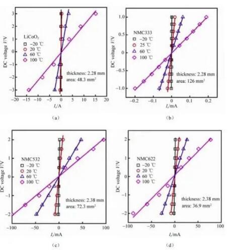 圖6直流極化或伏安特性曲線,用來測試鈷酸鋰和三元NMC的電子電導率。(a)鈷酸鋰;(b)NMC333;(c)NMC532;(d)NMC622;(e)NMC11;(f)與溫度關聯的電子電導率