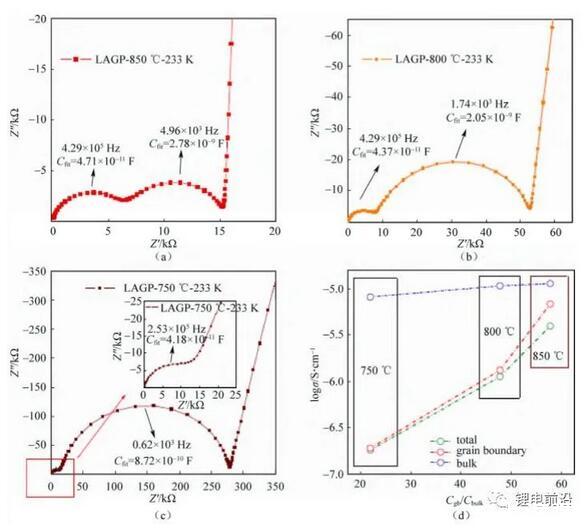 圖9不同溫度燒結的LAGP陶瓷片阻抗譜(233 K)及電導率和Cgb/Cbulk的比值關系