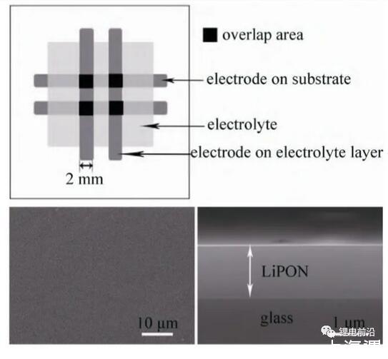 圖11三明治結構薄膜電極用于LPON電導率的測量及LPON薄膜電解質的XRD和SEM表面及斷面形貌