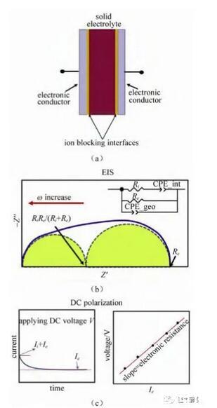 圖5塊狀樣品電子電導率和離子電導率的測試方法,(a)測試樣品示意圖,樣品兩側為離子阻塞電極;(b)典型的EIS測試數據Nyquist圖,由電子和離子的并聯電路構成;(c)直流極化曲線和伏安特性曲線,斜率為電子電阻
