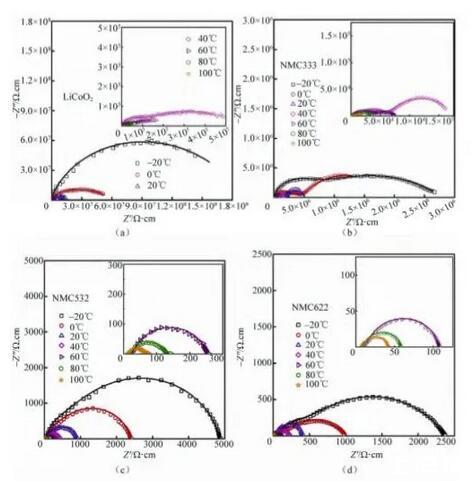 圖7鈷酸鋰和三元NMC的EIS測試結果20~100℃。(a)鈷酸鋰;(b)NMC333;(c)NMC532;(d)NMC622;(e)NMC811;(f)與溫度關聯的離子電導率