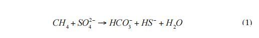在海洋陸架和大陸邊緣,AOM活動主要出現(xiàn)在沉積物的上部10 m處。AOM區(qū)域(圖1)通常被稱為“底棲甲烷過濾器”(Sommer et al.2006)。AOM是由微生物聯(lián)合體介導的,這些微生物利用硫酸鹽作為電子受體。這些菌群由硫酸鹽還原菌(SRB)和厭氧甲烷營養(yǎng)古菌(ANME)組成(Boetius et al.2000)。AOM財團減少硫酸鹽并氧化甲烷,生成硫化物和碳酸氫鹽(方程式1):
