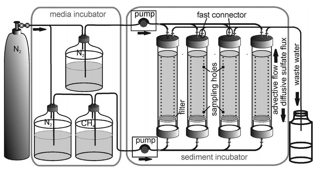 開發(fā)上述流通系統(tǒng)和生物反應(yīng)器是為了促進AOM生物體的最佳生長條件(Girguis et al.2003;Meulepas et al.2009),或通過單獨調(diào)整系統(tǒng)來分析選定因素的影響(Wegener和Boetius 2009;Deusner et al.2010;Zhang et al.2010;Wankel et al.2012)。在大多數(shù)情況下,使用的是沉積物泥漿,而不是完整的沉積物巖心(表1)。然而,在天然甲烷滲漏處,條件與傳統(tǒng)的人工設(shè)置非常不同。最重要的是,甲烷和硫酸鹽從不同的方向以不同的速度供應(yīng):甲烷與來自更深來源的流體平流,而硫酸鹽通過分子擴散從上覆水柱輸送(Borowski et al.1996)。此外,甲烷供應(yīng)的變化通常與流態(tài)的變化相關(guān)(Tryon等人,2002年;Tryon和Brown 2004年;Linke等人,2005年;LaBonte 2007年;Füri等人,2010年)。因此,海底甲烷過濾器不僅受到甲烷供應(yīng)量增加的挑戰(zhàn),還受到電子受體(即硫酸鹽)穿透深度變淺的進一步壓力(Niemann et al.2006)。最后,天然(完整)沉積物與實驗室沉積物泥漿(均質(zhì)沉積物-海水混合物)具有非常不同的特性(例如,孔隙度、滲透率、濃度梯度)。迄今為止,Girguis et al.(2003)和Wankel et al.(2012)的水流系統(tǒng)是唯一使用完整沉積物巖心的系統(tǒng)。然而,該系統(tǒng)缺乏技術(shù)可行性,無法監(jiān)測堆芯內(nèi)的生物地球化學隨時間的發(fā)展。因此,本研究的目的是開發(fā)一個新系統(tǒng),該系統(tǒng)能夠?qū)OM活動進行時序研究,并在整個巖芯長度上,將不同流體/甲烷流動狀態(tài)下完整沉積物巖芯中的生物地球化學參數(shù)關(guān)聯(lián)起來。槽系統(tǒng)有助于甲烷和硫的自然供應(yīng),并在實驗期間監(jiān)測生物地球化學梯度。在首次使用波羅的海Eckernf?rde灣的含氣沉積物應(yīng)用該系統(tǒng)時(例如,Treude et al.2005),我們重點關(guān)注以下研究問題:
