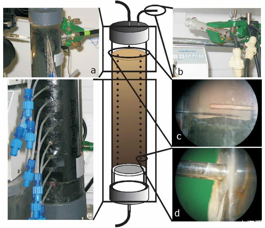 圖4:。槽芯取樣程序:(a)通過帶有pH針傳感器(左)和參考針電極(右)的硅填充取樣孔進行微傳感器測量;(b)用硼硅酸鹽注射器和快速接頭進行流出取樣;(c)核心底水中的微傳感器和根線;(d)穿過硅密封取樣孔的針狀傳感器;(e)通過取樣孔使用根線進行孔隙水取樣。