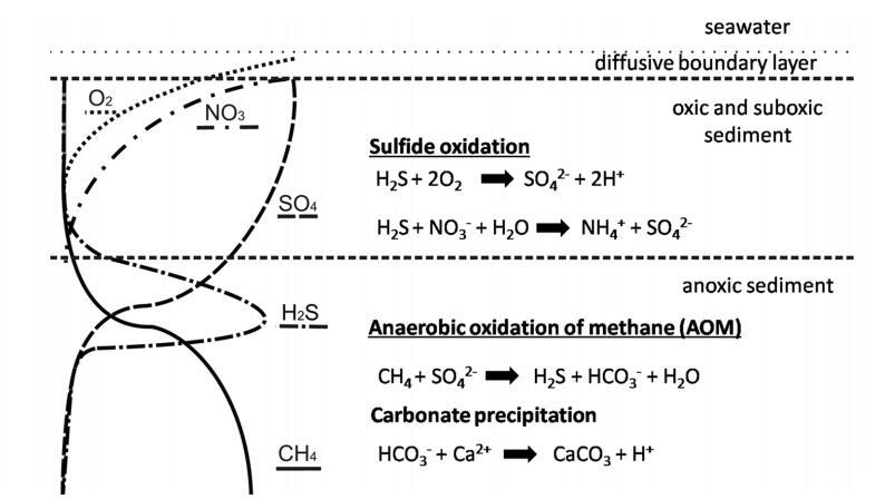 圖1:。冷泉特征生物地球化學過程示意圖。電子受體氧(虛線)、硝酸鹽(寬虛線)和硫酸鹽(虛線)的滲透。甲烷(實線)與滲流流體平流。硫化物(緊密虛線)和碳酸氫鹽是由甲烷的厭氧氧化(AOM)產(chǎn)生的,由甲烷營養(yǎng)古菌和硫酸鹽還原菌聯(lián)合體介導。自生碳酸鹽沉淀,硫化物被化能自養(yǎng)生物氧化。