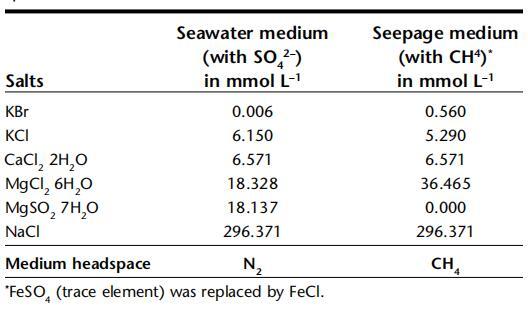 表2:。槽系統(tǒng)中使用的兩種不同介質(zhì)的鹽濃度。含硫酸鹽的海水介質(zhì)從頂部輸送,含甲烷的滲流介質(zhì)從底部輸送,不含硫酸鹽。在最后一行中,表示介質(zhì)頂部空間的氣體。