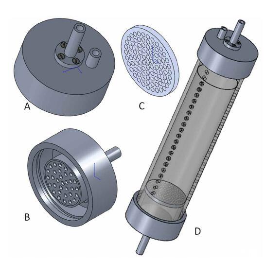 圖3:。槽襯套的單個組件。(A)頂蓋(外部視圖,PVC),帶進水管(中、長、分配容器未顯示)和出水管(短、右),(B)底蓋,帶進水管和分配容器(PVC),(C)帶開口的過濾器支架(PVC),(D)帶三行取樣孔的槽內(nèi)襯(聚碳酸酯),內(nèi)部配備過濾器支架(聚碳酸酯),頂蓋(進出口),和底蓋(流入口)。