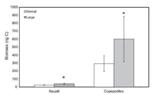 圖5。從正常和大型卵孵化的無節幼體(N1)和橈足類(C1-C2)的平均±SD生物量(ng C)。星號表示顯著差異。